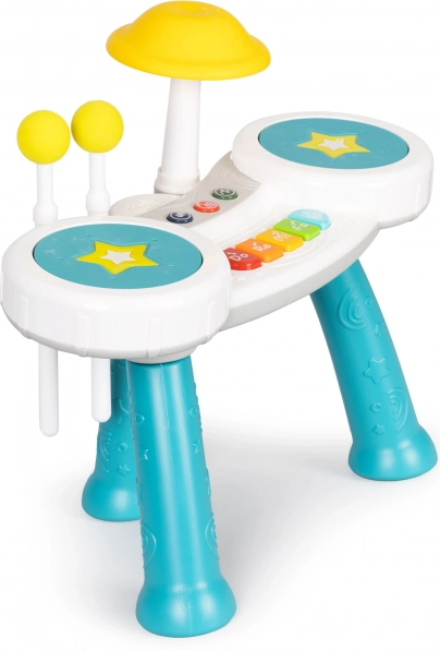 Dankzij de twee meegeleverde stokjes kan het kind drummen als op een echt drumstel en tussen modi wisselen.