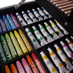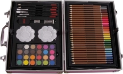 28× kleurpotlood, 33× viltstift, 24× oliepastel, 24× waterverf, 24× acrylverf, 2× gum, 2× palet, 2× potlood, 4× penseel, 1× puntenslijper, 1× koffer