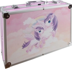 Ontdek de complete schilderset in een stevige roze koffer met eenhoornthema – ideaal voor kinderen en beginnende creatievelingen. Binnenin vind je alles voor tekenen, inkleuren en schilderen: viltstiften, kleurpotloden, oliepastels, waterverf en acrylverf plus praktische accessoires. Dankzij de organizer met vakjes blijven alle materialen overzichtelijk en veilig opgeborgen. Sterke metalen hoeken en sluitingen beschermen de inhoud tijdens het vervoeren.