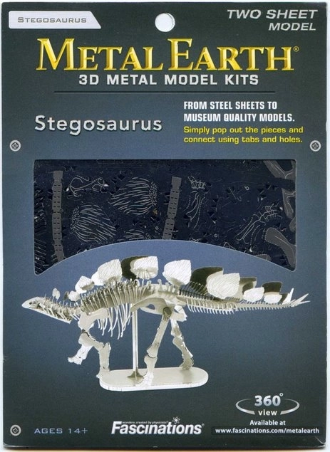 Een spannende uitdaging, bouwplezier en een oogverblindend resultaat – dat zijn de METAL EARTH-modellen! Het bouwen van de METAL EARTH 3D-puzzel vereist geduld en vaardige handen. Het eindresultaat maakt de inspanning volledig de moeite waard! De miniatuurreplica’s zijn een bijzonder opvallende en aantrekkelijke decoratie, niet alleen thuis, maar ook op kantoor of op school. Uit vierkante stalen plaatjes (11 x 11 cm) met onderdelen van wereldmonumenten, beroemde vervoermiddelen, muziekinstrumenten of dieren ontstaan onder je handen gedetailleerde, fascinerende modellen. De authentieke uitstraling van de METAL EARTH 3D-puzzels wordt bereikt dankzij het gedetailleerde lasergraveren. De verpakking bevat 2 stalen plaatjes met onderdelen en een montagehandleiding. Gereedschap is niet inbegrepen. WERKWIJZE: Haal de afzonderlijke onderdelen uit de metalen plaatjes; gebruik indien nodig een kleine zijkniptang (niet inbegrepen). De onderdelen worden met elkaar verbonden via vergrendelingen die bestaan uit een lipje en een opening. Buig het lipje om met een kleine, fijne tang (niet inbegrepen) en verbind stap voor stap alle vergrendelingen totdat er een zeer realistisch meesterwerk ontstaat! Aanbevolen leeftijd: vanaf 14 jaar. De Stegosaurus is een geslacht van vogelheupdinosaurussen dat leefde in het Jura. De naam betekent ‘gedekte hagedis’ en verwijst naar de platte platen: kleinere op de nek en grotere op de rug en het voorste deel van de staart. Samen met de geslachten Tyrannosaurus, Triceratops en Apatosaurus (voorheen ‘Brontosaurus’) behoort hij tot de bekendste dinosaurussen. Meer op Wikipedia Afmeting van het voltooide model ca. 14 x 7,6 x 2,5 cm
