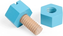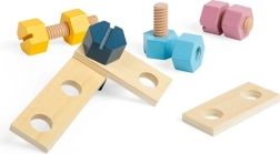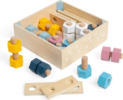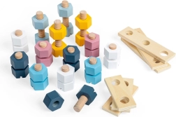 Deze tijdloze houten set met moeren, bouten en latjes met gaten moedigt kinderen aan om de eerste principes van constructief spel te ontdekken. Zachte pastelkleuren, de aangename textuur van hout en veilige vormen prikkelen de zintuigen en de verbeelding.