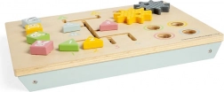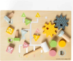 De tafel omvat een reeks activiteiten ter ondersteuning van de vroege ontwikkeling: kinderen kunnen pinnen inslaan met het houten hamertje, schroeven met dierenkoppen aandraaien, houten tandwielen laten draaien of genummerde driehoeken in de juiste openingen plaatsen. Het speelgoed is gemaakt van ethisch verkregen FSC®-hout en voldoet aan de huidige Europese veiligheidsnormen.