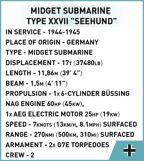 De Seehund (Type XXVII B) was een Duitse mini-onderzeeër uit 1944, bediend door een tweekoppige bemanning en ingezet aan het einde van de Tweede Wereldoorlog. Deze gelicenseerde verzamelset is ontstaan in samenwerking met het Deutsches Marinemuseum, waar een van de weinige bewaard gebleven exemplaren wordt tentoongesteld. De COBI-bouwset legt de karakteristieke lijnen van het origineel natuurgetrouw vast in de geoptimaliseerde schaal 1:72.