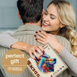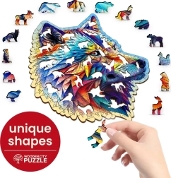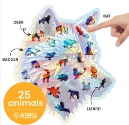 Geniet van slimme ontspanning met de houten puzzel WOODEN CITY – Nobele Wolf. Dankzij speciaal gevormde stukjes, waarvan sommige de vorm van dieren hebben en als kleine figuurtjes kunnen staan, is het leggen boeiender en uitdagender dan bij klassieke puzzels. Door laser benadrukte details geven het motief diepte en elegantie.