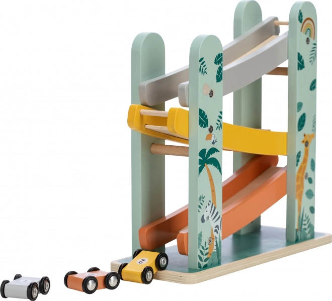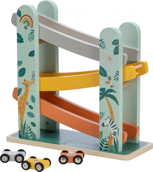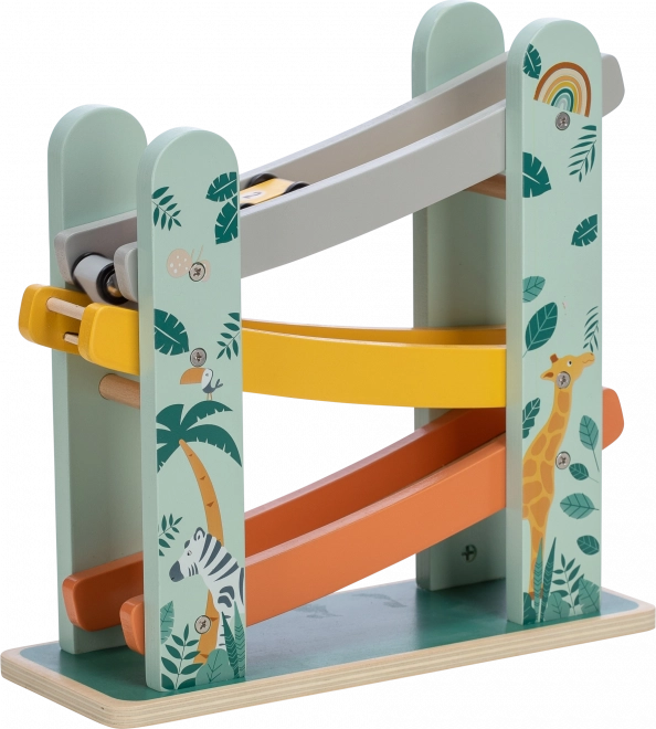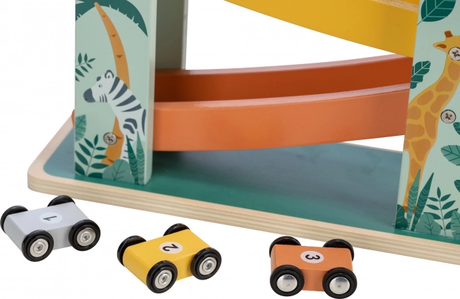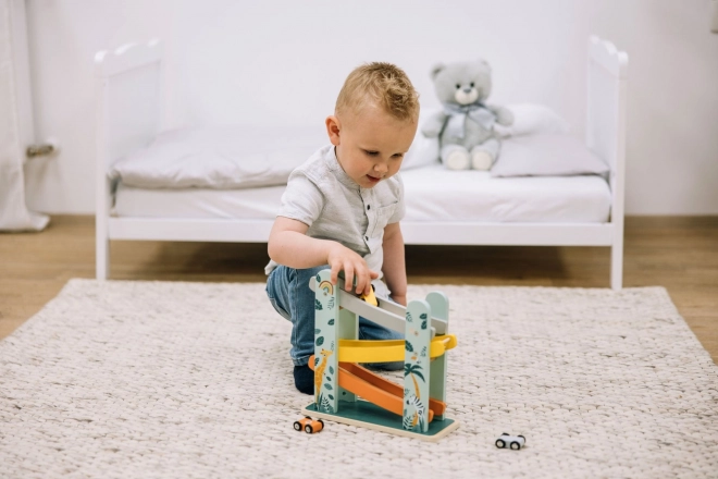 We presenteren u een geweldige houten racebaan met drie autootjes! Geniet van de kleurrijke variatie van de baan en kijk hoe uw kinderen met enthousiasme de autootjes van de ene verdieping naar de andere zien tuimelen. Het is aangekleed met prachtige motiefillustraties van dieren die het een speelse draai geven. De autootjes hebben rubberen banden voor stabiel rijden en ontwerp aan beide zijden.