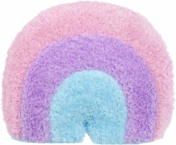 Pluchen speelgoed in de vorm van een regenboog in roze, paars en blauw met een vriendelijke glimlach. Ideaal voor decoratie of als knuffel voor kinderen.