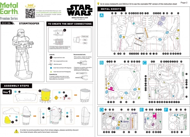 De verpakking bevat drie metalen platen met uitgestanste onderdelen, een pincet en een gedetailleerde montagehandleiding. Gebruik haakjes en een fijne tang om de onderdelen te verbinden (niet inbegrepen).