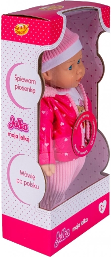 Pop Julka geniet ervan wanneer je voor haar zorgt en met haar gaat wandelen. De zachte pop is gekleed met een muts, sjaal, overall met gestreepte broek en een roze gewatteerd jasje met capuchon, afgezet met gestreepte stof in de kleur van de broek.