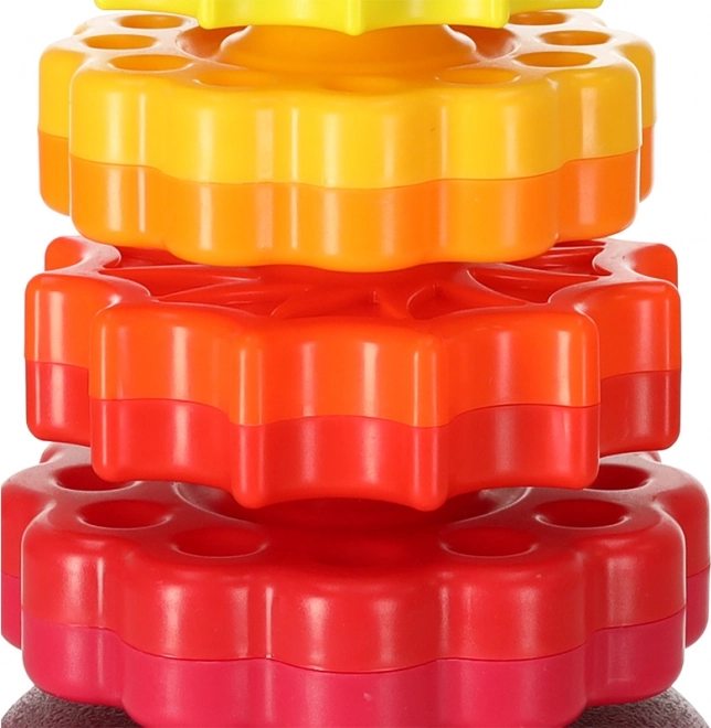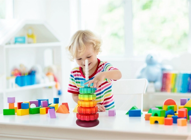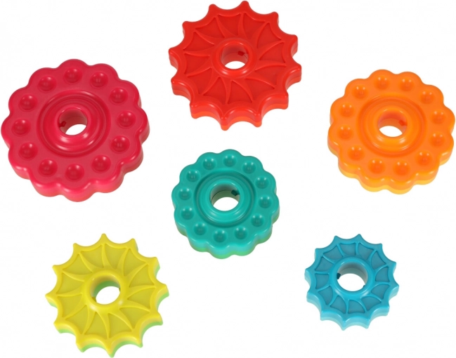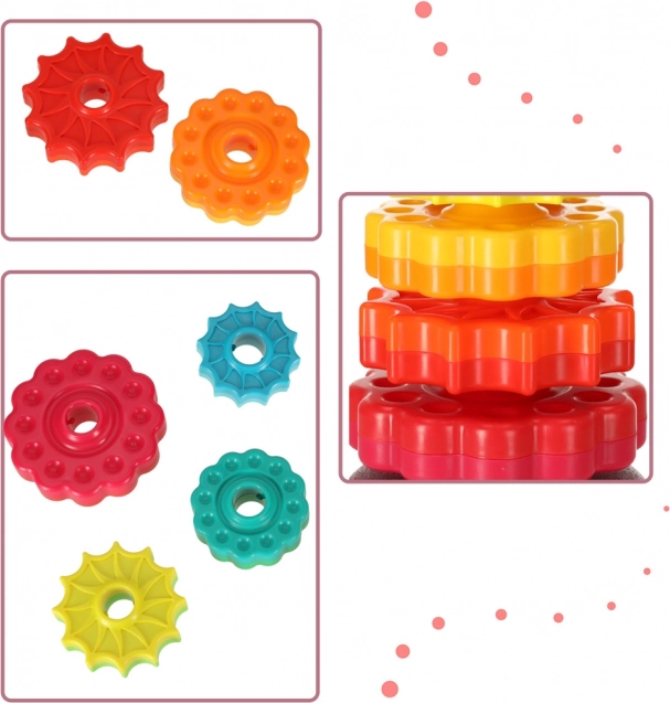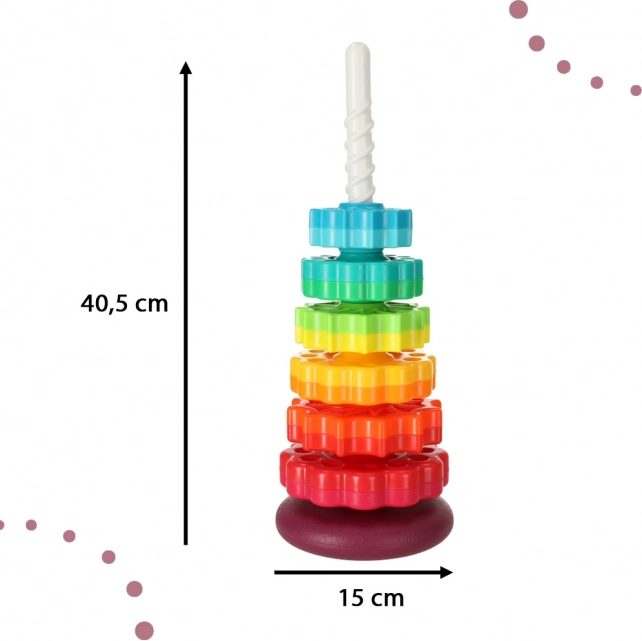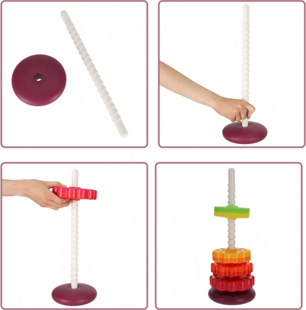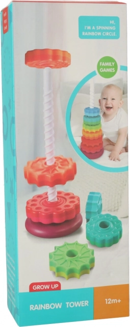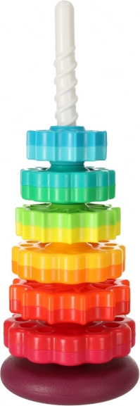 Deze kleurrijke spiraaltoren verenigt beweging, kleuren en texturen in één speels geheel. Kinderen plaatsen getande ringen op de kunststof spiraalstaaf, volgen hun rotatie en horen de subtiele geluiden tijdens het naar beneden glijden. Het spel stimuleert de oog–handcoördinatie, oorzaak–gevolg en het sorteren op grootte en kleur.