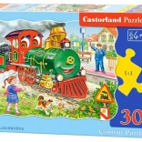Kleurige kinderpuzzel met een groene locomotief, bevat 30 stukjes en vormt na het leggen een afbeelding van 32 × 23 cm. Ideaal voor de eerste puzzelervaring, met hoogwaardige afwerking en aantrekkelijke kleuren die concentratie, geduld en verbeeldingskracht stimuleren.