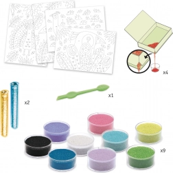 Kinderen verwijderen met de meegeleverde spatel de gemarkeerde zelfklevende vlakken. Op deze plekken strooien ze vervolgens gekleurd zand of glitters volgens de bijbehorende nummers. Overtollig zand kan dankzij de opening in de hoek van het doosje terug in het juiste potje worden gegoten.
