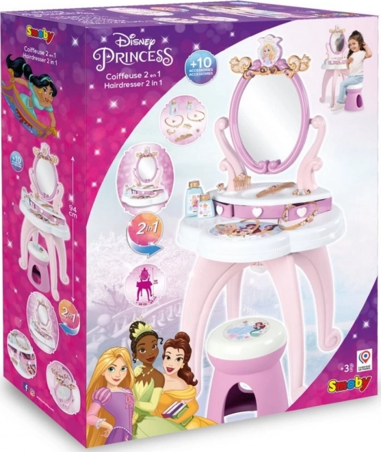 Tover de kamer om tot een magisch beautyhoekje met de Smoby Disney Princess 2-in-1 kaptafel. Dankzij de verstelbare, kantelbare spiegel en het afneembare blad kunnen kinderen comfortabel spelen op de vloer, aan de tafel of aan het bureau. Het stijlvolle prinsessendesign stimuleert fantasie, rollenspel en de fijne motoriek.