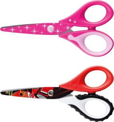 De schaar heeft afgeronde punten voor extra veiligheid en ergonomisch gevormde handgrepen. De variant Boy valt op door een textuur die aan een autoband doet denken, de variant Girly door decoratieve strassteentjes. Afbeelding ter illustratie – kleur en motief worden willekeurig geleverd afhankelijk van de actuele voorraad.