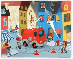 Praktische combinatie van een houten puzzel en een plastic brandweerauto met wieltjes. Spelen en opbergen op één plek dankzij het slimme opbergdeksel.