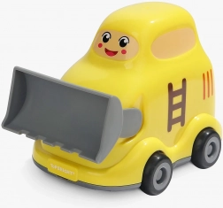 De bulldozer van duurzaam kunststof heeft gladde randen, rijdt op wieltjes en biedt een praktische openende klep voor het opbergen van puzzelstukjes of kleine schatten.