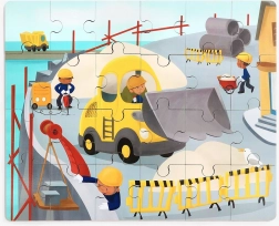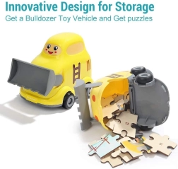 Ontdek een slimme speelgoedset die speelplezier met leren combineert. De houten puzzel met een voertuigenthema (bouwplaats) is verstopt in de kunststof bulldozer. Deze heeft een veilige, gladde afwerking, wieltjes om te rijden en een openende onderklep waarin kinderen de puzzel of hun schatten gemakkelijk kunnen opbergen.