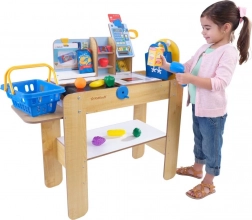 De set bevat 30 hoogwaardige accessoires (etenswaren, mandje, creditcard, tas, bankbiljetten en munten) en een draaibare stelling voor tassen zoals in een echte winkel. De houten KIDKRAFT-constructie zorgt voor stabiliteit en duurzaamheid, ideaal voor dagelijks spel.