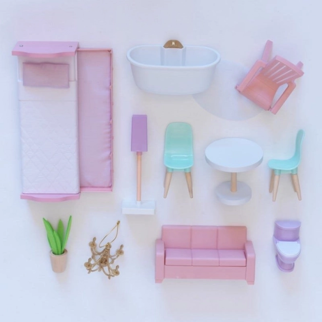 Met twee verdiepingen, twee kamers en een aparte badkamer biedt het poppenhuis voldoende ruimte voor spel met poppen en accessoires. De meegeleverde 12 meubelstukken maken het mogelijk om meteen te beginnen en de indeling naar wens te veranderen.