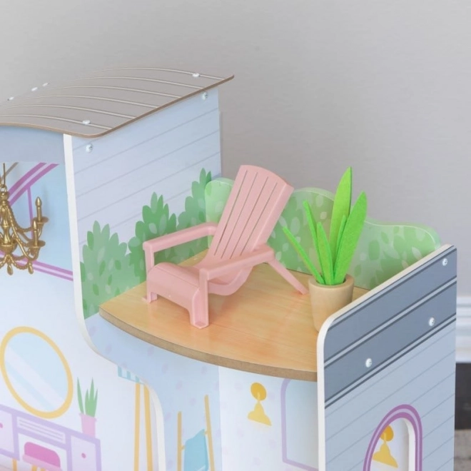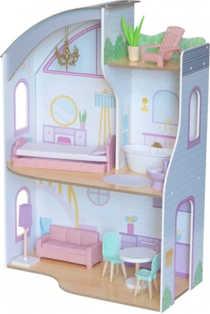 Poppenhuis KidKraft Elise: 2 verdiepingen, 2 kamers en badkamer, 12 meubelstukken, pastelkleuren. Kwalitatieve afwerking voor kinderen vanaf 3 jaar.