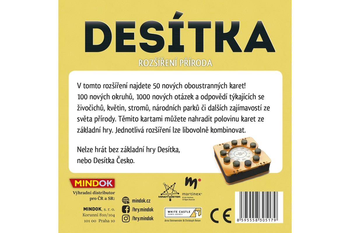 In deze uitbreiding vind je 50 nieuwe dubbelzijdige kaarten! 100 nieuwe categorieën, 1000 nieuwe vragen en antwoorden over landen, steden, bezienswaardigheden, talen en andere wetenswaardigheden van over de hele wereld. Met deze kaarten kun je de helft van de kaarten uit het basisspel vervangen. De afzonderlijke uitbreidingen kunnen naar wens worden gecombineerd. Inhoud van de verpakking: 50 dubbelzijdige kaarten. LET OP: Dit is een uitbreiding. Kan niet gespeeld worden zonder het basisspel Desítka, of Desítka Tsjechië. Geschikt voor kinderen vanaf 12 jaar.