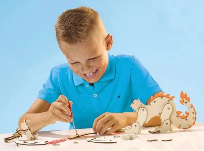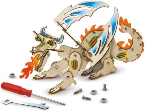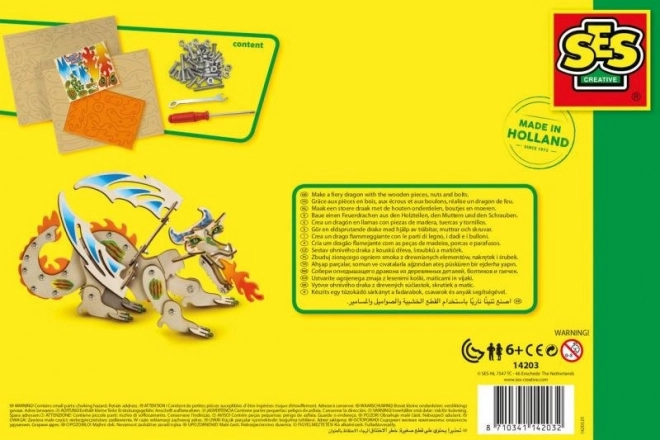 Stimuleer vaardigheid en verbeeldingskracht met de constructieset van SES Creative voor het maken van een houten draak. In de doos vind je multiplex onderdelen, schroeven en moeren, praktisch gereedschap en foamaccessoires voor veilig en gemakkelijk monteren. Stap voor stap volgen kinderen de handleiding om hun eigen draak te bouwen en deze tot slot af te werken met stickers.
