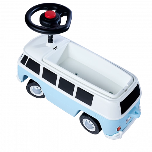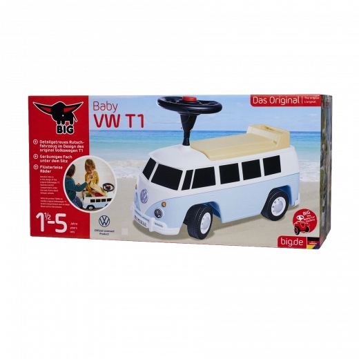 Gedetailleerde loopauto in Volkswagen T1-design met afneembare zitting, kleine rugleuning en achterste trekhaak. Met de Baby VW T1 voegt BIG een ander klassiek voertuig toe aan zijn inmiddels gediversifieerd wagenpark. Het rijvoertuig is tot in elk detail gemodelleerd naar zijn voorbeeld, de Volkswagen T1, en biedt een reeks functionele verbeteringen. Onder de uitneembare zitting met kleine rugleuning bevindt zich een ruime opbergruimte waarin persoonlijke spullen van de bestuurder veilig kunnen worden opgeborgen. De wielen hebben stille, niet-strepende banden die geen sporen achterlaten, waardoor de camper ook ideaal is voor gebruik binnenshuis. Max. draagvermogen 50 kg. Afmetingen: 60,5 x 23 x 37 cm. Gewicht 3,4 kg. Met dubbelwandig stuur met geïntegreerde mechanische claxon. De Baby VW T1 wordt geproduceerd in de moderne BIG-fabriek in Duitsland en is getest op maximale veiligheid. Officieel gelicenseerd door Volkswagen.