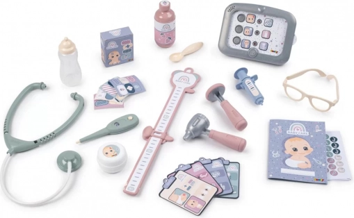 26 accessoires, waaronder stethoscoop, injectiespuit, thermometer, flesje en luier, stimuleren de verbeelding, empathie en fijne motoriek van kinderen.