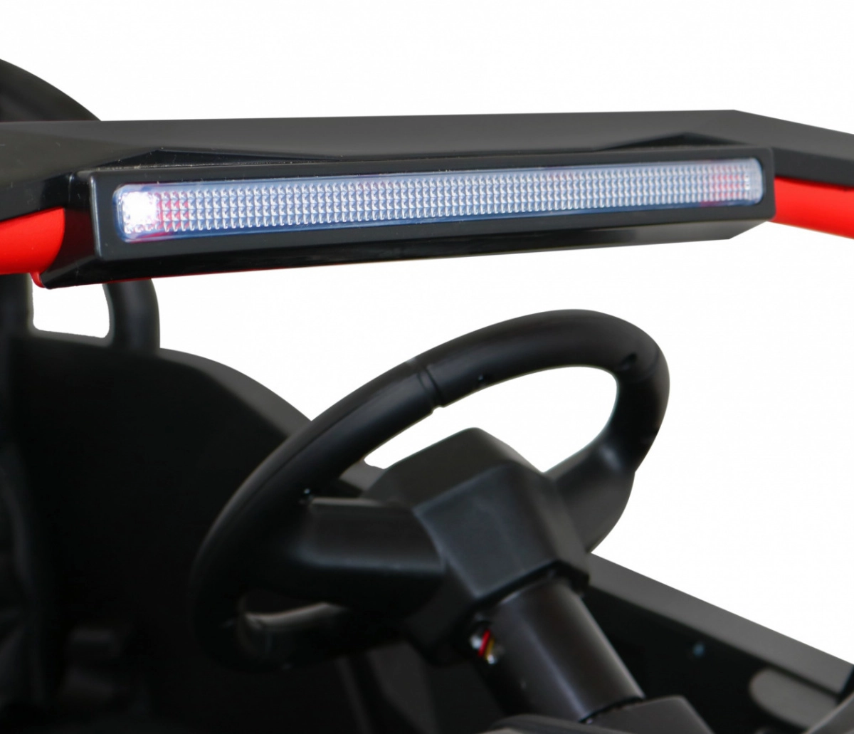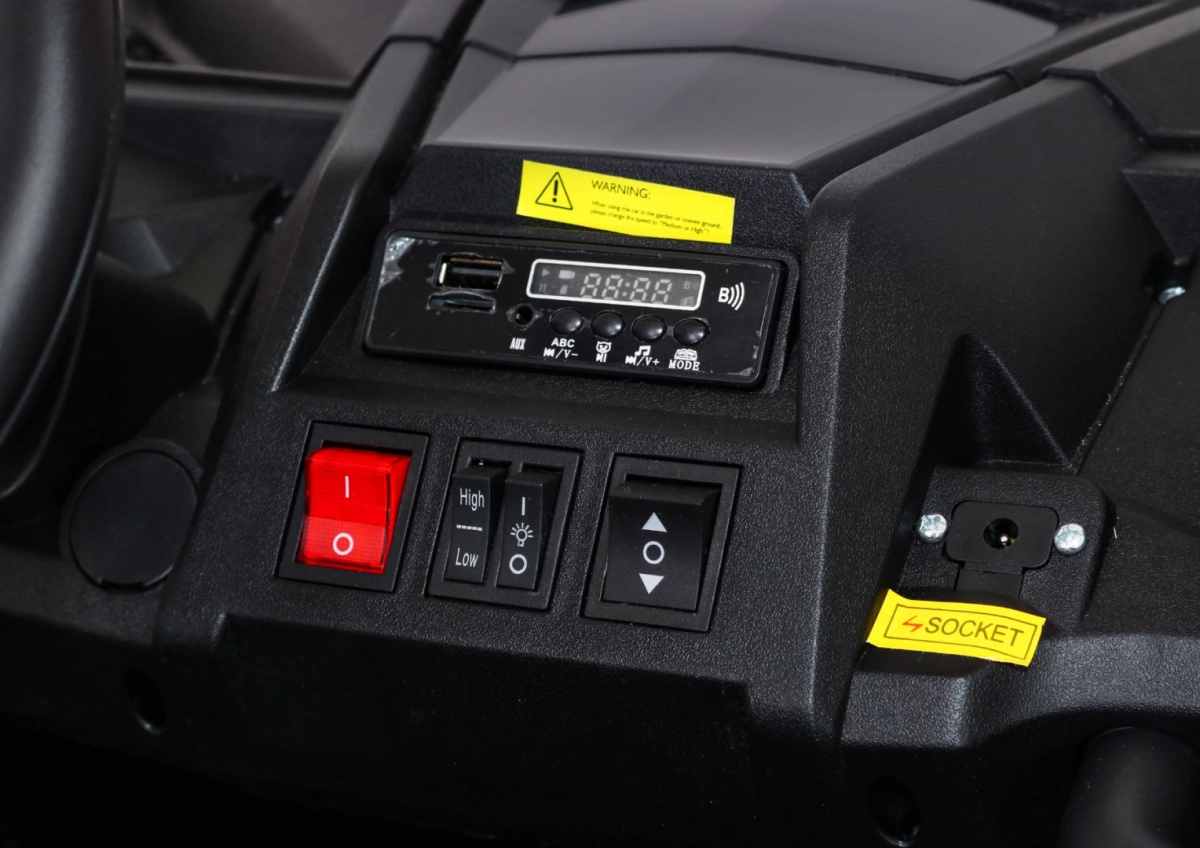 Het interieur verrast met een geventileerde zitting van eco-leer met veiligheidsgordels en 3-traps verstelling (60×26×32 cm). Kinderen genieten van muziek via MP3, USB, AUX en Bluetooth en leuke geluiden in het stuur. Ouders houden de controle met de 2,4 GHz afstandsbediening (3 snelheden, veiligheidsknop Stop). Praktisch zijn de te openen deuren, laadindicator en realistische start met motorgeluid.