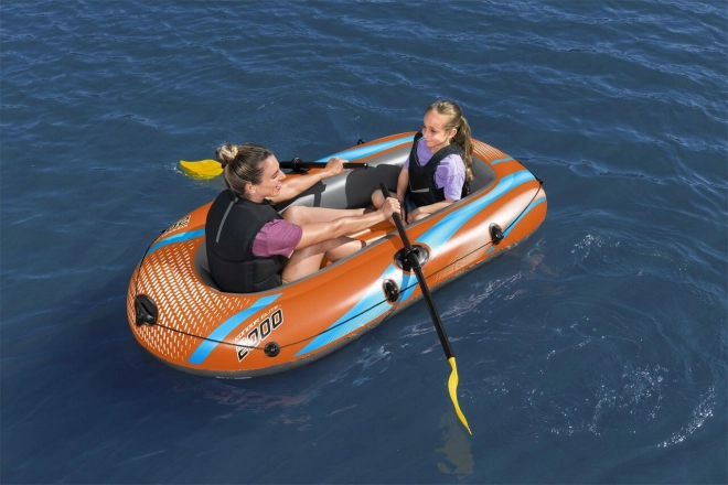 De opblaasbare vloer biedt extra zitcomfort, terwijl de volledig opgeblazen structuur stabiliteit en veilige vaart op rustige wateren verzekert.