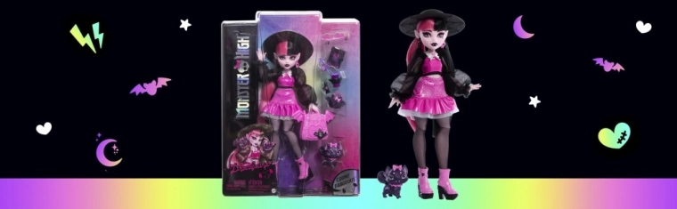 De pop Draculaura betovert met een uitgewerkte outfit in roze en zwart, die haar iconische, licht gothic uiterlijk benadrukt. Het setje wordt aangevuld met thematische accessoires en een trouw huisdiertje, waarmee kinderen eenvoudig tientallen verhalen bedenken. Dankzij de gewrichten kun je de pop gemakkelijk laten poseren voor spel of display.