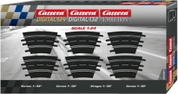 De verpakking bevat 6 delen, samen goed voor een boog van 180°. Dankzij de R1-radius kun je scherpere secties maken die de spanning van de races vergroten en de layout variabeler maken. Voor een perfecte afwerking kan worden aangevuld met binnenrand 20590 en buitenrand 20567.