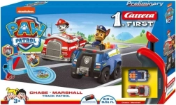 Leuke autobaan voor de kleinste racers: CARRERA First met Paw Patrol-thema biedt een baan van 2,9 m, een analoge batterijvoeding, twee auto's CHASE en MARSHALL, een versmalling voor spannende duels, een draaiende poort en veilige controllers voor kinderen vanaf 3 jaar.