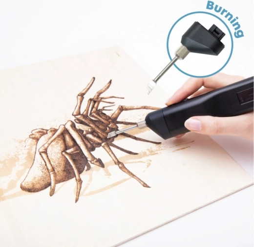 Geschikt voor het decoreren van houten voorwerpen, leren accessoires of voor het personaliseren van cadeaus. Een stabiele prestatie en compatibiliteit met het Multipro-systeem stellen je in staat snel te schakelen tussen 3D-tekenen, snijden, solderen en branden.
