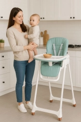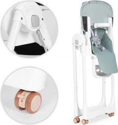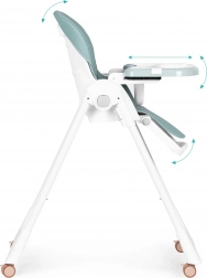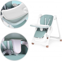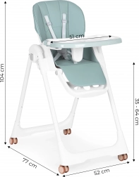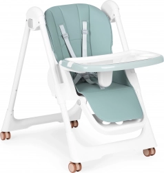 De dubbele tray met verhoogde randen en bekerhouder vermindert knoeien en de bovenste laag haal je na de maaltijd eenvoudig af om te reinigen. De bekleding van eco-leer veeg je schoon met een vochtige doek. Wielen met rubber loopvlak maken verplaatsen eenvoudig zonder de vloer te krassen en geïntegreerde wielvergrendelingen fixeren de stoel betrouwbaar.