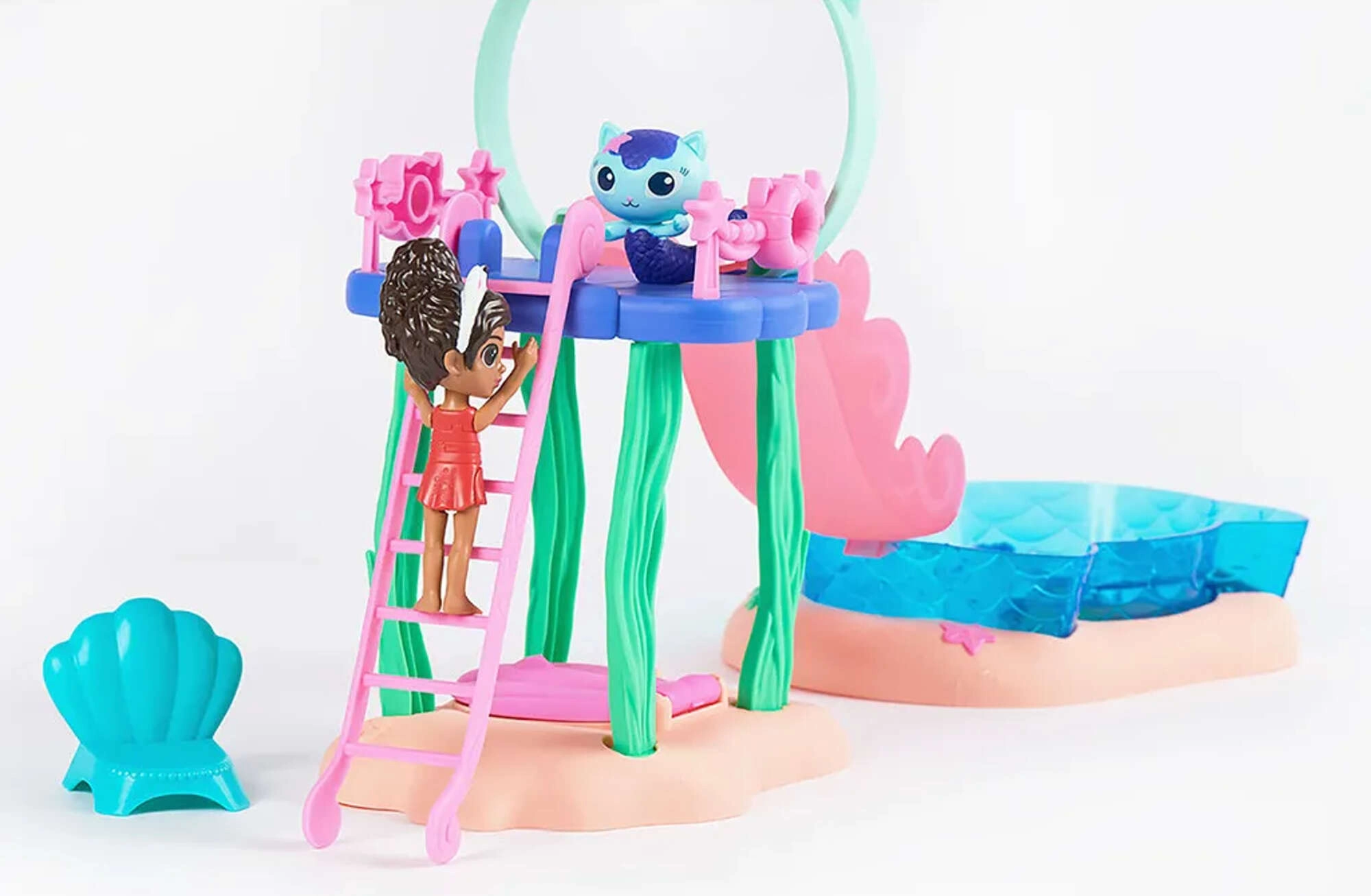 - Gabby-figuur met afneembare zeestaart, Zeemeow-figuur, glijbaan, zwembad, ladder, schelp met afbeelding, “inktvis”-verstuiver, drijvers, Kattenpost met minifiguur en QR-code