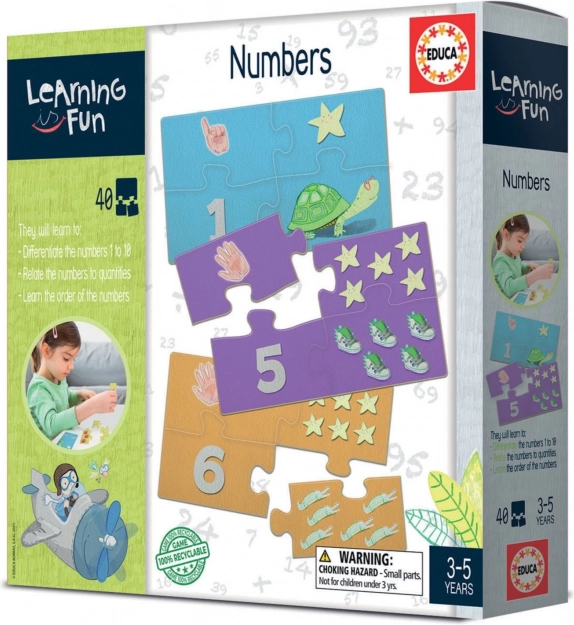 Ontdek de speelse weg naar wiskunde met de serie EDUCA Learning is Fun. Deze set maakt kinderen vertrouwd met de cijfers 1–10, leert ze eerste rekensommen en verbindt het cijfer, het aantal afbeeldingen en vingers. Elk cijfer bestaat uit 4 puzzelstukjes, die fijne motoriek, logisch denken en geduld ontwikkelen. Bovendien is het product 100% recyclebaar.