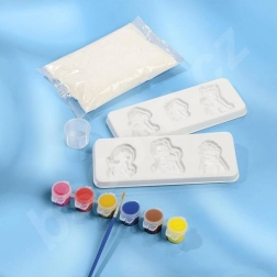 - Bevat 6 vormpjes, gips, maatbeker, 6 kleuren en een penseel
