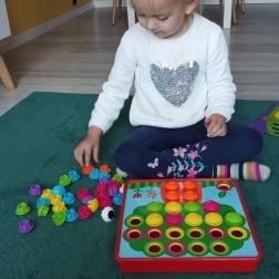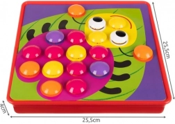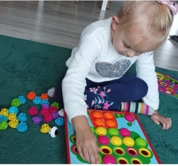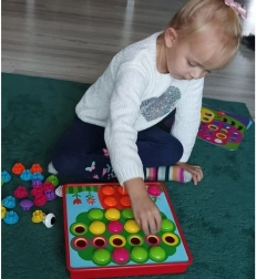 Deze kleurrijke educatieve mozaïek is ideaal voor kleuters. Dankzij de grote, gemakkelijk vast te houden pinnetjes oefenen kinderen de vingervaardigheid, coördinatie en het leren van kleuren. De set bevat thematische sjablonen die inspireren en het eerste leggen vergemakkelijken.
