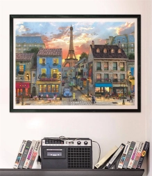 Een romantische straat met de Eiffeltoren en een avondlijke sfeer vormt na het leggen een decoratief beeld dat geschikt is om in te lijsten.