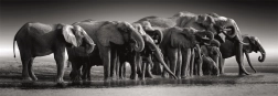 De indrukwekkende zwart-witfoto van olifanten bij het water geeft het voltooide beeld een tijdloze uitstraling en past perfect in een modern interieur.