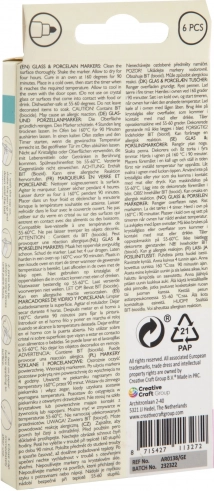 Marker voor porselein en glas – met deze marker kun je op porselein en glas schilderen. De kleuren zijn waterbestendig. Kan in de vaatwasser. Handleiding op de productverpakking.