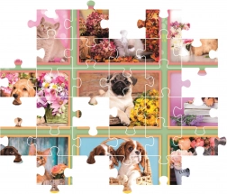 Een collage vol puppy’s (en kittens) met bloemen die dierenliefhebbers zal verrukken en na het leggen elke kinderkamer siert.