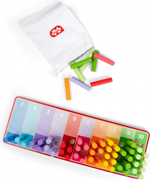 Regenboogtelstokken zijn de ideale keuze voor kinderen vanaf 18 maanden die willen leren tellen en kleuren herkennen. Het speelgoed bevat een houten bord met gekleurde secties en 55 gekleurde stokken om in deze secties te plaatsen. Alle onderdelen van dit product zijn gemaakt van FSC® gecertificeerd hout, waardoor ze niet alleen veilig zijn voor kinderen, maar ook milieuvriendelijk.