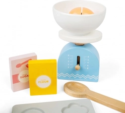 Met deze houten bakset voor kinderen bezorg je ze uren speelplezier en stimuleer je tegelijk hun verbeelding. De set bevat een houten bakplaat, weegschaal, uitsteekvormpjes, deegroller, kom, boter, ei, bloem, suiker en melk. Keukenveiligheid leren ze spelenderwijs.