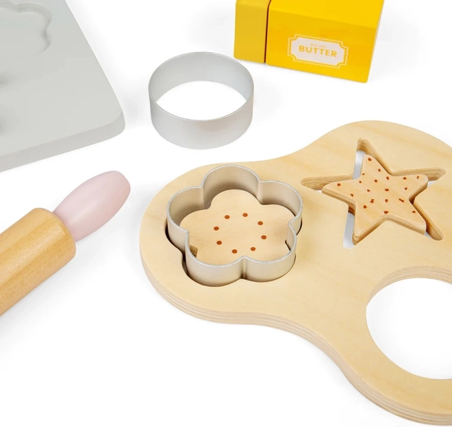 De set biedt alles wat een kleine bakker nodig heeft: bakplaat, weegschaal, kom, deegroller, uitsteekvormpjes en meer.