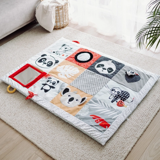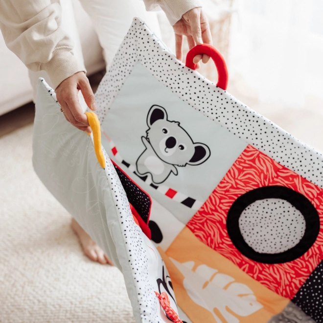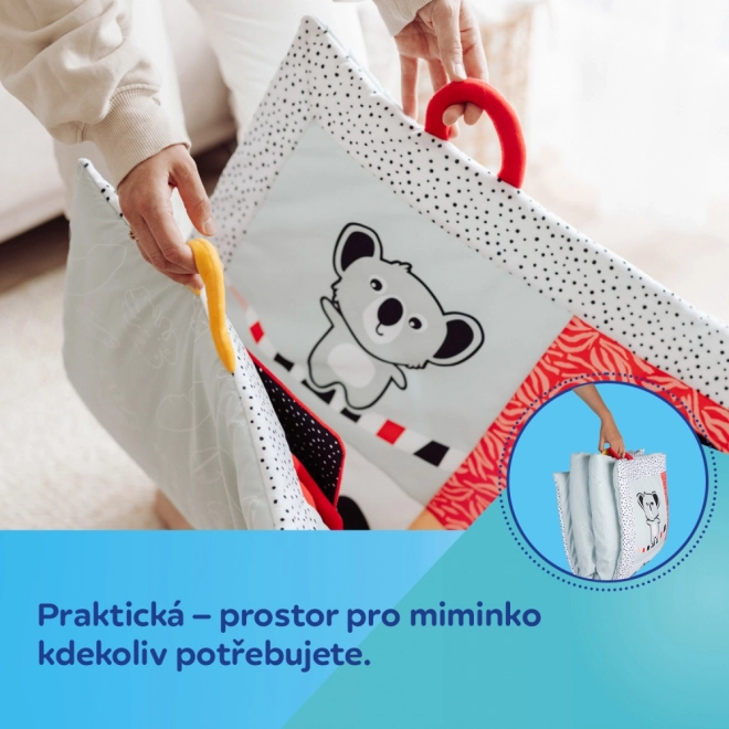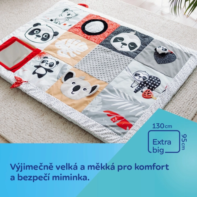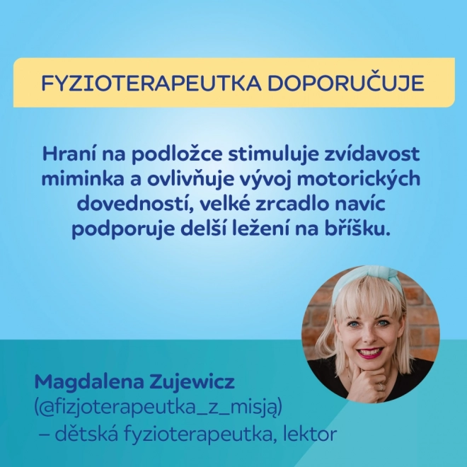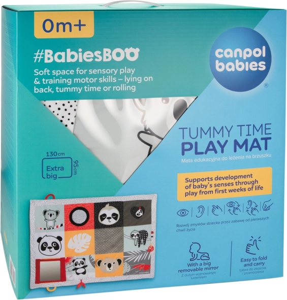 De sensorische educatieve speelmat Canpol babies voor tummy time uit de BabiesBoo-collectie is een veilige en aangename manier om je baby in beweging te houden en geeft ouders even tijd voor zichzelf of voor huishoudelijke taken. De mat is uitzonderlijk groot en zacht – 130 x 95 cm biedt je kleintje comfort en veiligheid. De educatieve mat van Canpol babies is gemakkelijk op te vouwen, heeft een handige draaggreep waardoor hij eenvoudig te dragen is, zodat je overal waar nodig een kinderhoek kunt creëren. De grote spiegel stimuleert en verlengt de tijd op de buik, waarbij je baby telkens verschillende delen van de mat kan verkennen. Talrijke zintuiglijke elementen prikkelen de zintuigen van het kind: zicht, gehoor en tast. Diverse materiaaltexturen, contrasterende kleuren en patronen en zachte geluiden zorgen voor geweldig vermaak voor de zich ontwikkelende zintuigen van je baby vanaf de allereerste levensmomenten. De sensorische leerzame mat van Canpol babies helpt de juiste motorische ontwikkeling van elk kind te ondersteunen. De mat is wasbaar in de wasmachine.Kinderhoek overal waar we die nodig hebben.Aanbevolen door fysiotherapeut Magdalena Zujewicz – kinderfysiotherapeut, opvoeder en SI-therapeut.Uitzonderlijk grote en zachte mat biedt je baby comfort en veiligheid.De grote spiegel wekt de interesse van de baby en verlengt de tijd die op de buik wordt doorgebracht.Veel elementen die de zintuigen van het kind betrekken: zicht, gehoor en tast.Eenvoudig op te vouwen dankzij de comfortabele handgreep die het dragen vergemakkelijkt.Contrasterende kleuren en patronen ondersteunen de ontwikkeling van het gezichtsvermogen van het kind.Ondersteunt de ontwikkeling van de tast en traint de fijne motoriek.Verbetering van hand-oogcoördinatie en audio-motorische coördinatie.Gemakkelijk schoon te houden – machinewasbaar.Ideaal voor kinderen vanaf de eerste levensmomenten.Het speelgoed is gemaakt van veilig materiaal zonder bisfenol A.Afmetingen van de mat: 130 x 95 cmGebruiksaanwijzing:De wijze van reinigen staat op het etiket vermeld. Was de mat, met uitzondering van de spiegel, in de wasmachine op maximaal 30°C op een fijnwasprogramma. Houd de speelmat schoon. Was de speelmat, behalve de spiegel, in de wasmachine bij max. 30°C met een delicaat programma. Gebruik een milde wasmiddel speciaal voor baby’s. Apart wassen. Veeg de spiegel af met een vochtige doek. Verwijder de beschermfolie van de spiegel.Waarschuwing! Belangrijk voor de gezondheid en veiligheid van je kind! Controleer vóór elk gebruik zorgvuldig. Vervang versleten/beschadigd speelgoed door nieuw.Waarschuwing! Uit de buurt houden van open vuur. Bewaar de handleiding voor later gebruik.De mat voldoet aan de eisen van:Richtlijn 2009/48/EG van het Europees Parlement en de Raad inzake de veiligheid van speelgoedEN 71 - 1 Speelgoedveiligheid - Deel 1: Mechanische en fysieke eigenschappenEN 71 - 2 Speelgoedveiligheid - Deel 2: OntvlambaarheidEN 71 - 3 Speelgoedveiligheid - Deel 3: Migratie van bepaalde elementen
