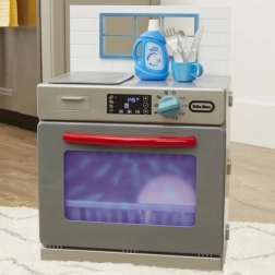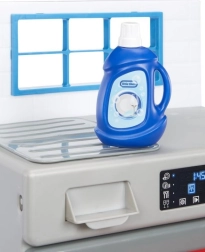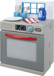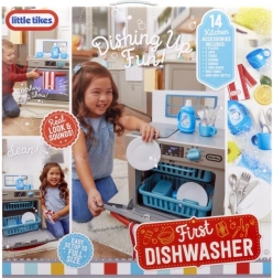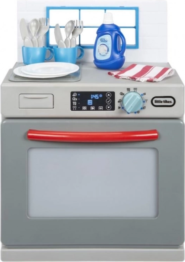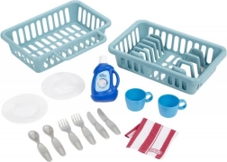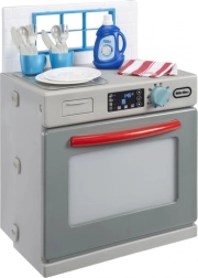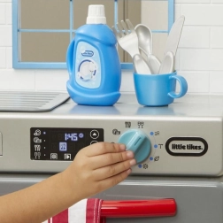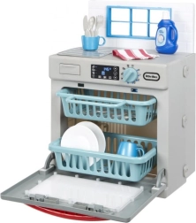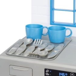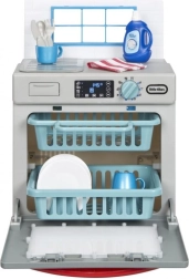 Kleine helpers zullen het realistische design van de grijze vaatwasser met rode accenten waarderen, die eruitziet als echte apparaten. Na het toevoegen van het “middel” en het draaien aan de functionele knop gaat het licht aan en starten authentieke wasgeluiden. Kinderen kunnen deurtjes openen, manden uitschuiven en servies in- en uitladen, waarbij ze hun motoriek en verbeelding ontwikkelen.