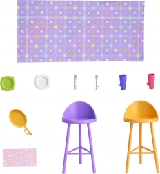 Barbie-huis, Barbie-pop, 11 accessoires (bijv. servies, 2 stoelen, handdoek, dekentje e.d.)