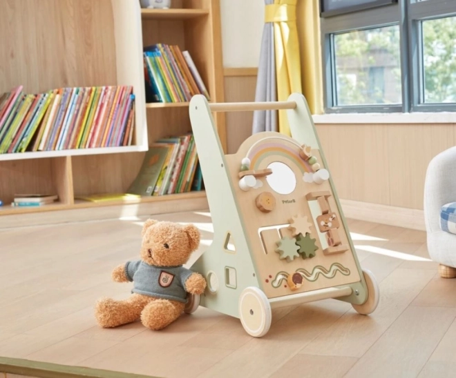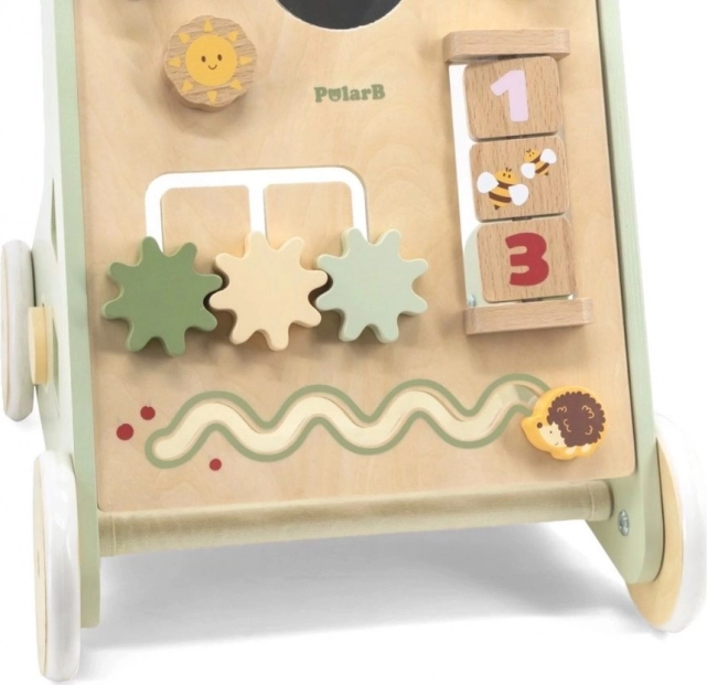 De houten duwloopwagen PolarB Viga is ontworpen om kinderen veilig te begeleiden bij hun eerste stapjes en hen tegelijk te motiveren om te ontdekken. Het voorpaneel biedt tal van activiteiten – van draaiende tandwielen en schuiflabyrinten tot vormsorteren en een spiegeltje, die op natuurlijke wijze de zintuigen en het logisch denken ontwikkelen.