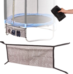 Nooit meer rondslingerende schoenen of kleine spullen rond de trampoline. De gaas tas onder de trampoline is een universele organizer die eenvoudig aan het frame wordt vastgeknoopt en veilig schoenen en andere benodigdheden opbergt. Dankzij het duurzame polyester en het ademende gaas droogt hij snel en blijft hij licht.